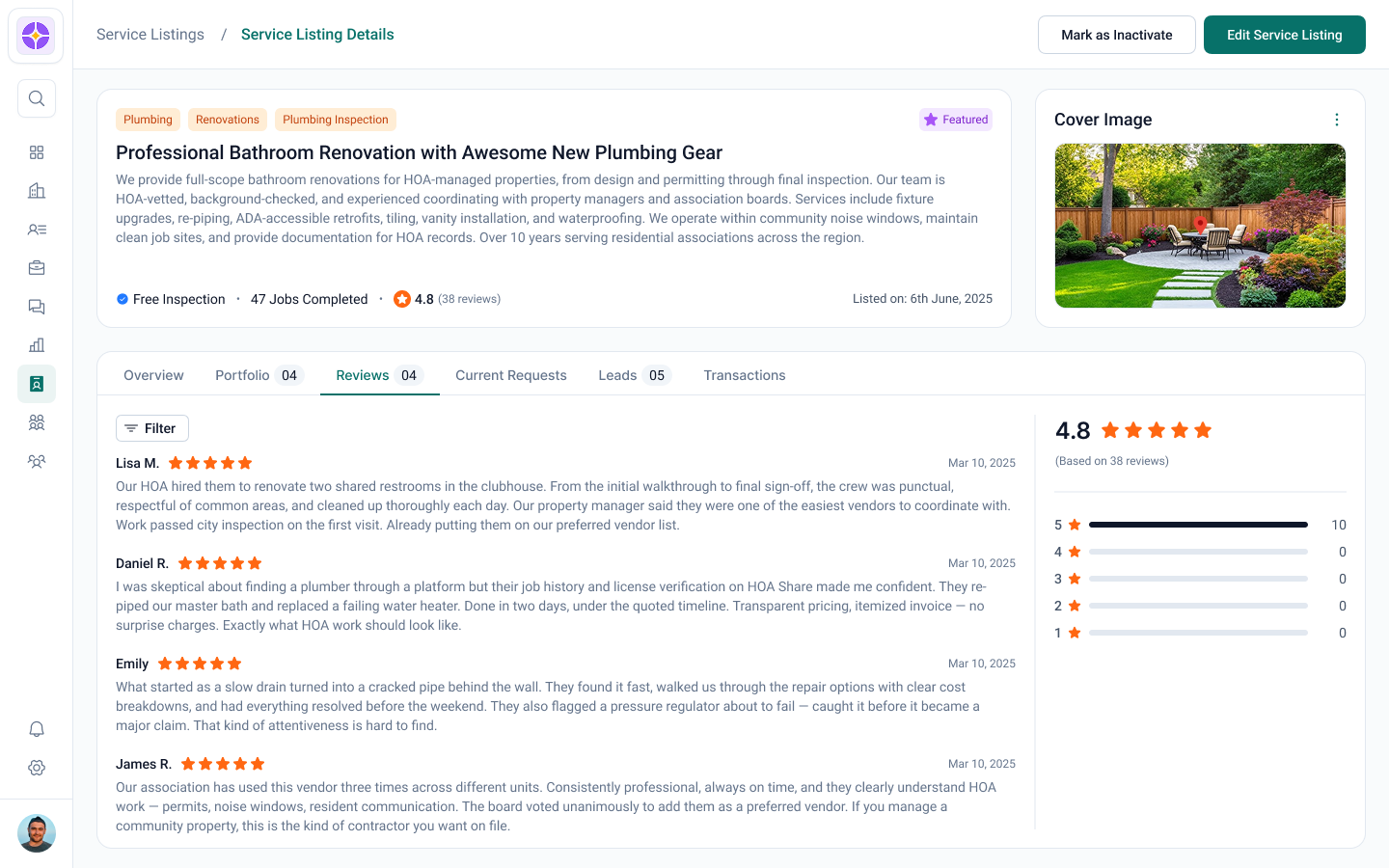 Every completed job builds your profile. Verified reviews from real homeowners, response time metrics, completion rates, and quality scores — all visible to property managers choosing vendors. The better you perform, the more leads you get. It's a flywheel.